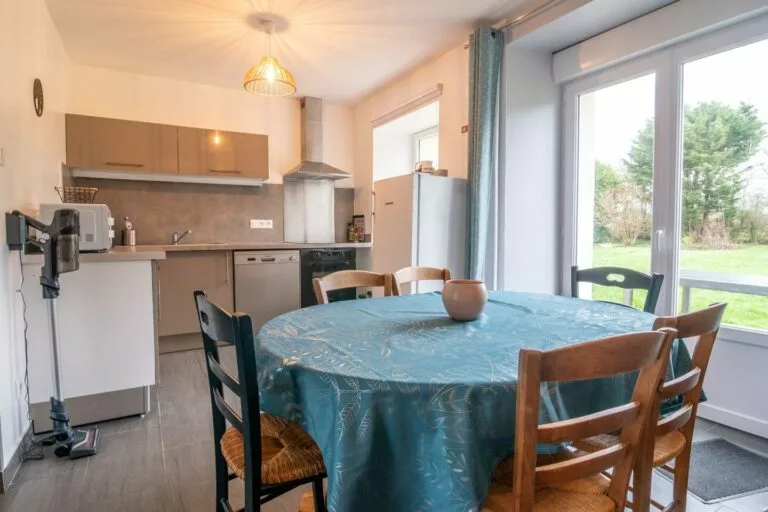 Vous y trouverez une grande pièce de vie avec cuisine équipée (frigo, four, micro-onde, bouilloire, cafetière, grille-pain, lave-vaisselle, lave-linge), un espace salle à manger et un coin salon.